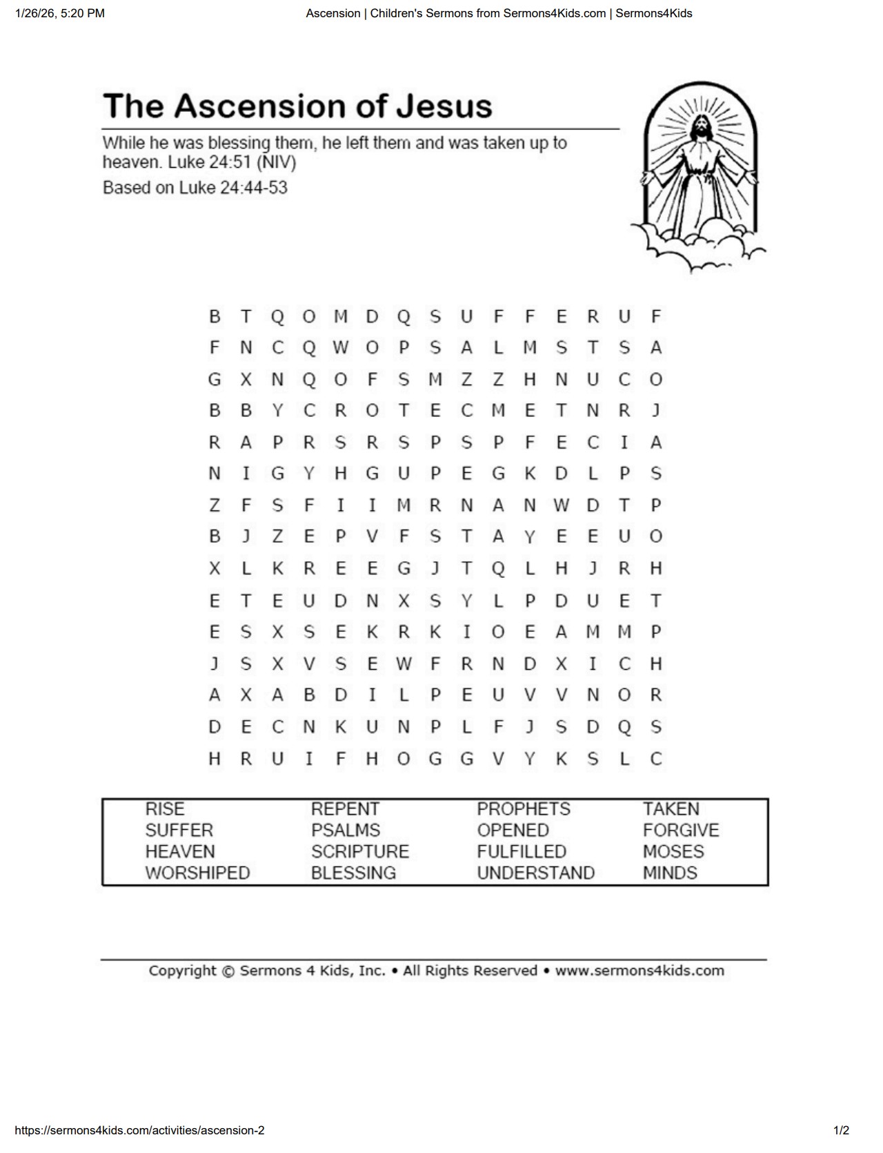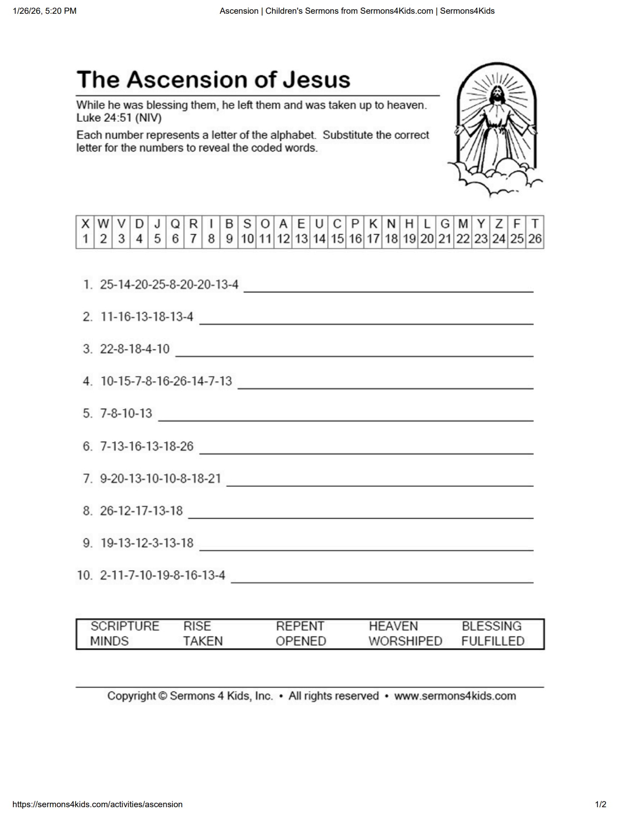 Jesus' Appearances from Resurrection to Ascension, Coloring – Jesus' Ascension, Ascension – Word Search, Ascension – Decoder